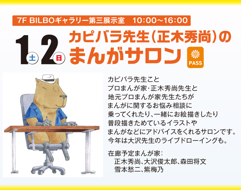 - 出演 DAY1 黒江S介 先生DAY2 地主 先生日時 DAY1 11月1日(土)14:00~15:00DAY2 11月2日(日)14:00~15:00会場 7F BILBOギャラリー第一・第二展示室特設ステージ※まんさいパスのみでご覧いただけますライブドローイング イラストプレゼント企画!黒江S介先生、地主先生の描いたイラストをプレゼント。