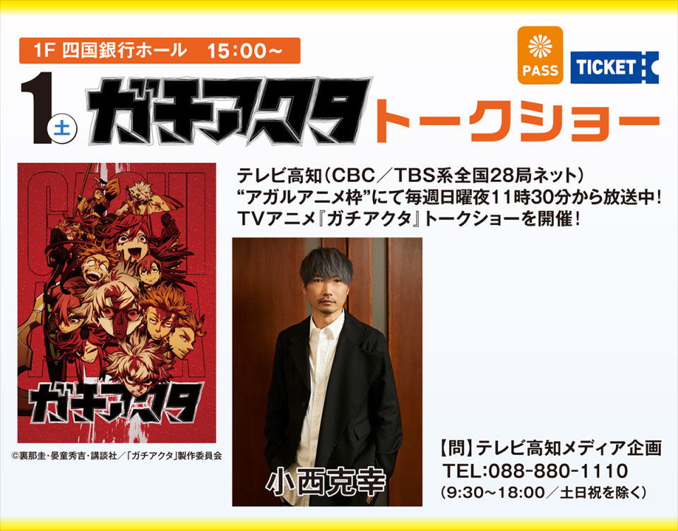 - ガチアクタトークショー出演 小西克幸日時 11月1日(土)15:00~16:00(14:30開場)会場 四国銀行ホール詳細はテレビ高知公式HPに掲載※入場にはまんさいパスとステージイベント専用指定席券が必要です。前売指定席券:1,300円(税込)購入はこちら→ローソンチケット当日券:1,500円(税込)7階ガチアクタ物販ブース(KUTVブース)にて販売※当日券については「現金のみ」となります。またチケットの販売状況によっては当日券の販売を行わない場合があります。