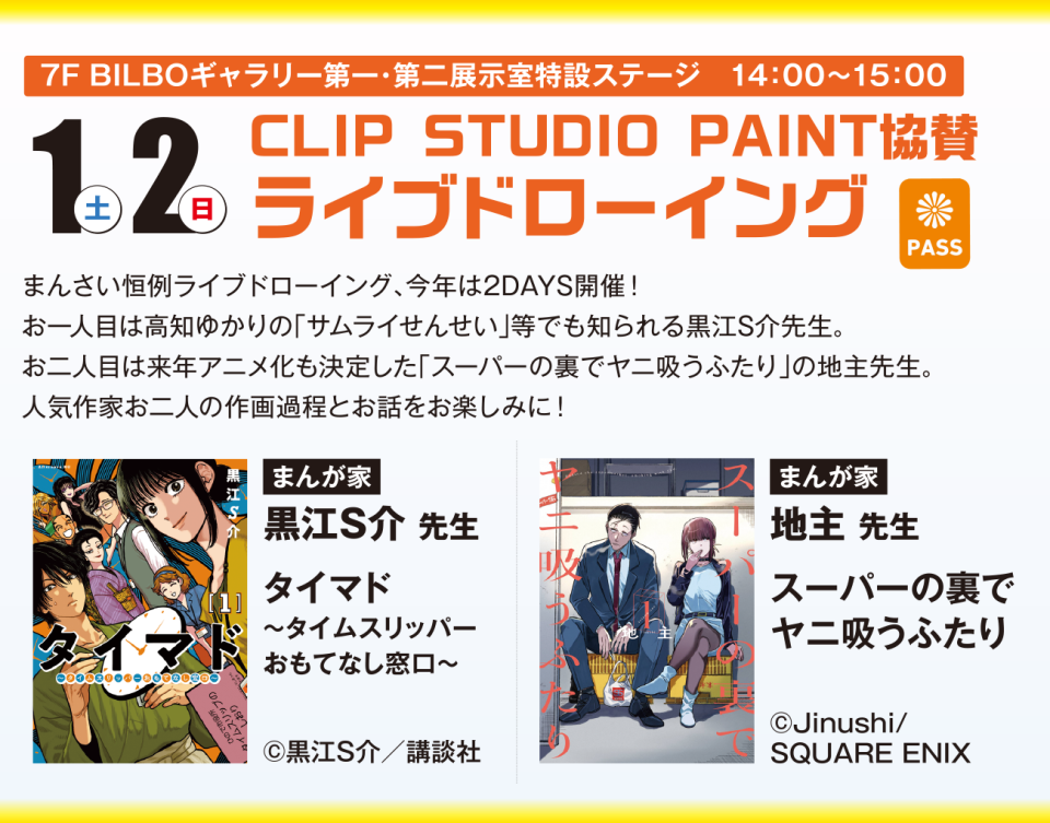 - 出演 DAY1 黒江S介 先生DAY2 地主 先生日時 DAY1 11月1日(土)14:00~15:00DAY2 11月2日(日)14:00~15:00会場 7F BILBOギャラリー第一・第二展示室特設ステージ※まんさいパスのみでご覧いただけますライブドローイング イラストプレゼント企画!黒江S介先生、地主先生の描いたイラストをプレゼント。