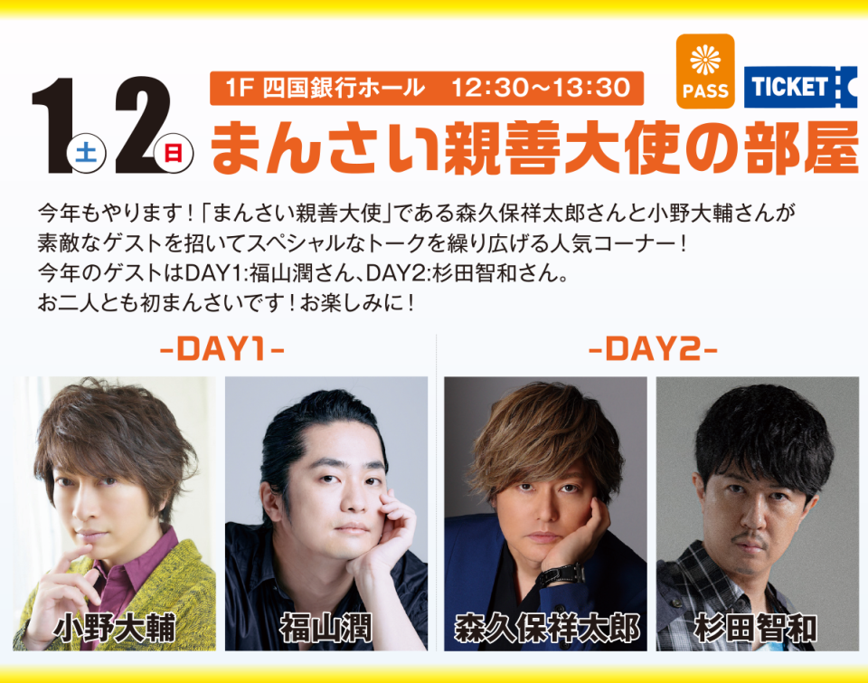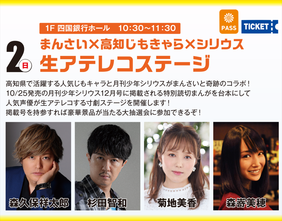 会場 四国銀行ホール※入場にはまんさいパスとステージイベント専用指定席券が必要です。前売指定席券:各2,400円(税込)購入はこちら→ローソンチケット当日券:各2,400円(税込)7階総合受付にて販売※当日券については「現金のみ」となります。またチケットの販売状況によっては当日券の販売を行わない場合があります。